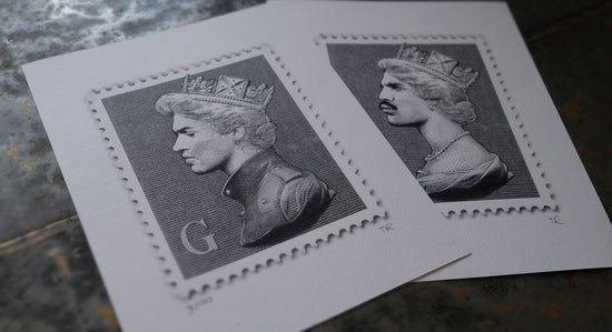 Inspired by the iconic design of a vintage Queen Elizabeth postage stamp - right down to the textured, embossed finish, this is the perfect piece of art to make a longtime Queen fan very happy.