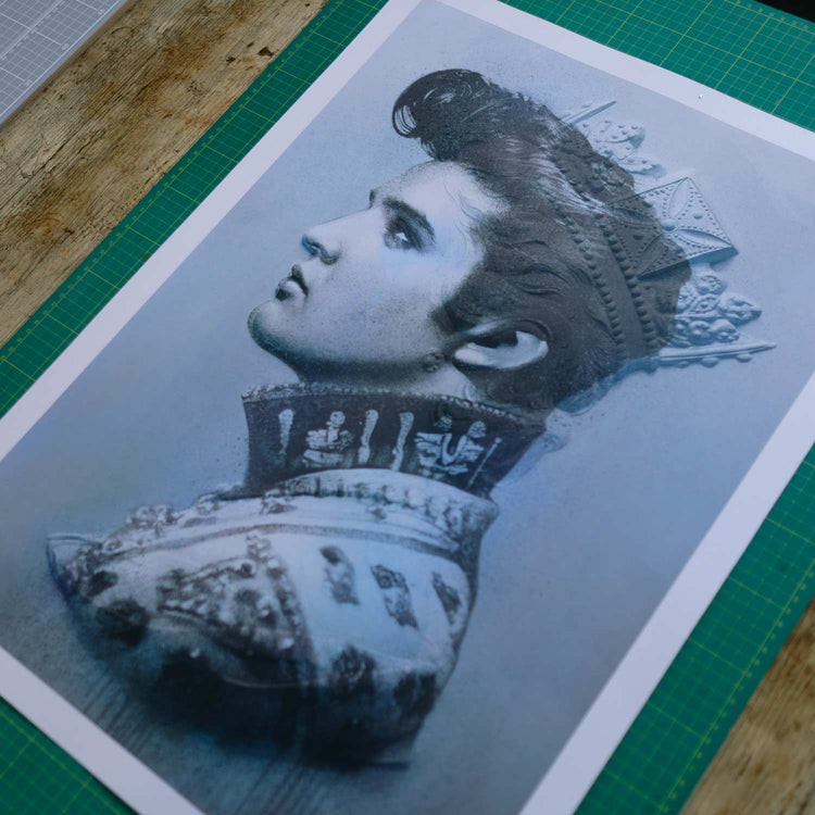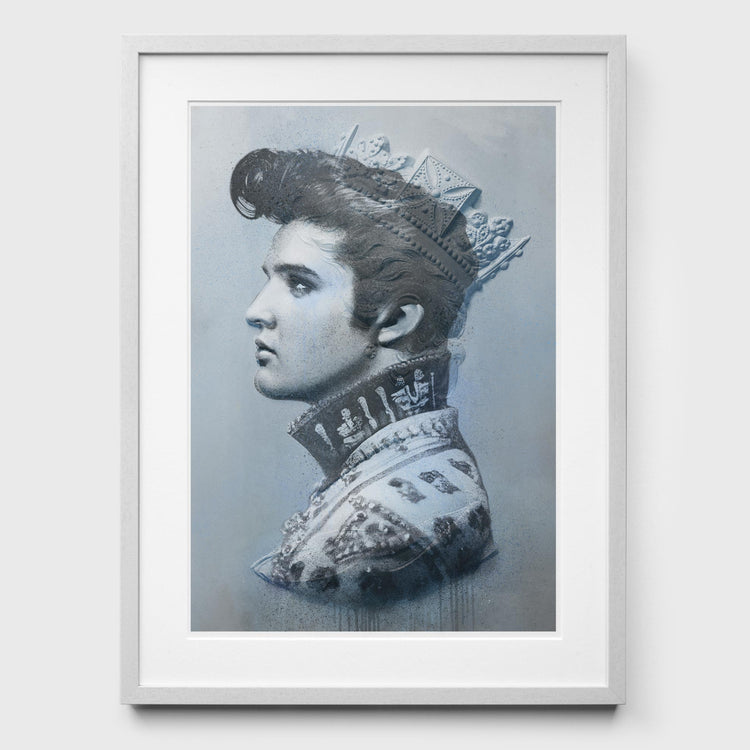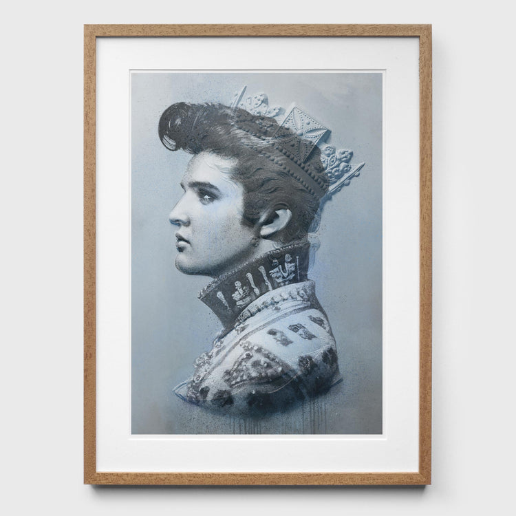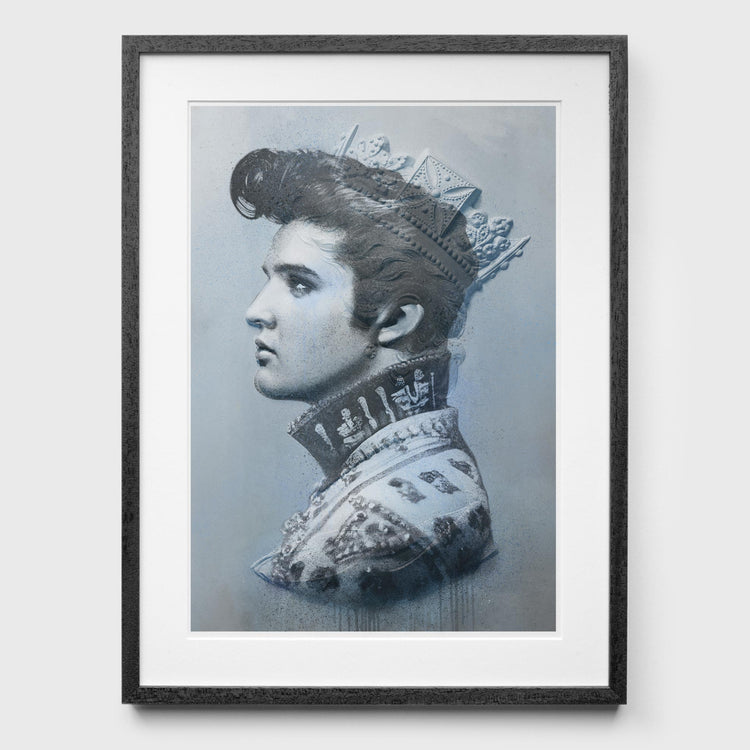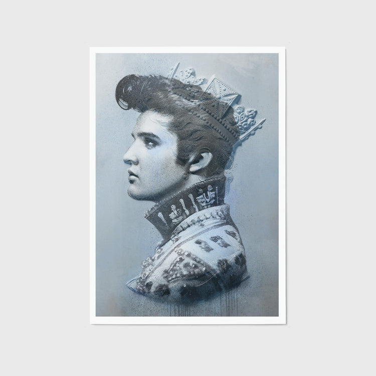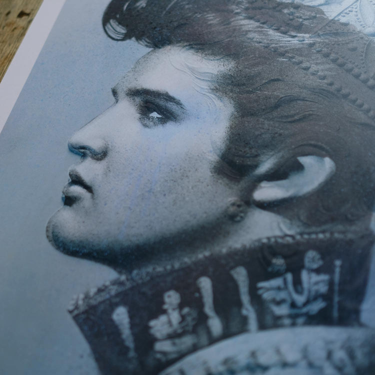 Elvis Presley is the King of wall decor! Get ready to feel some burning love for this iconic art print of the legendary King of Rock n Roll. The soft shimmer finish due to the iridescent paper stock adds extra flair, making it impossible to resist falling in love. It's all shook up and ready for you!